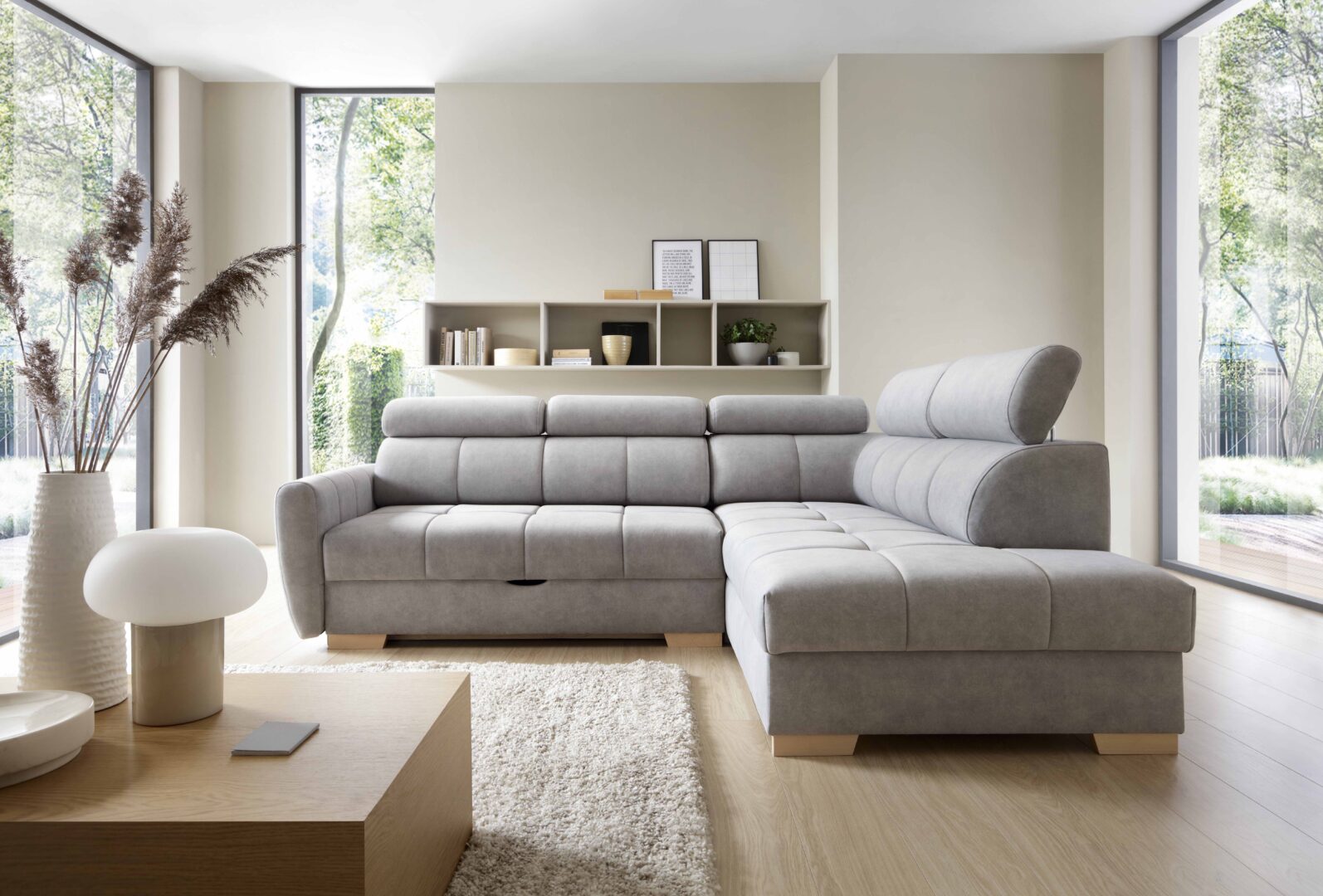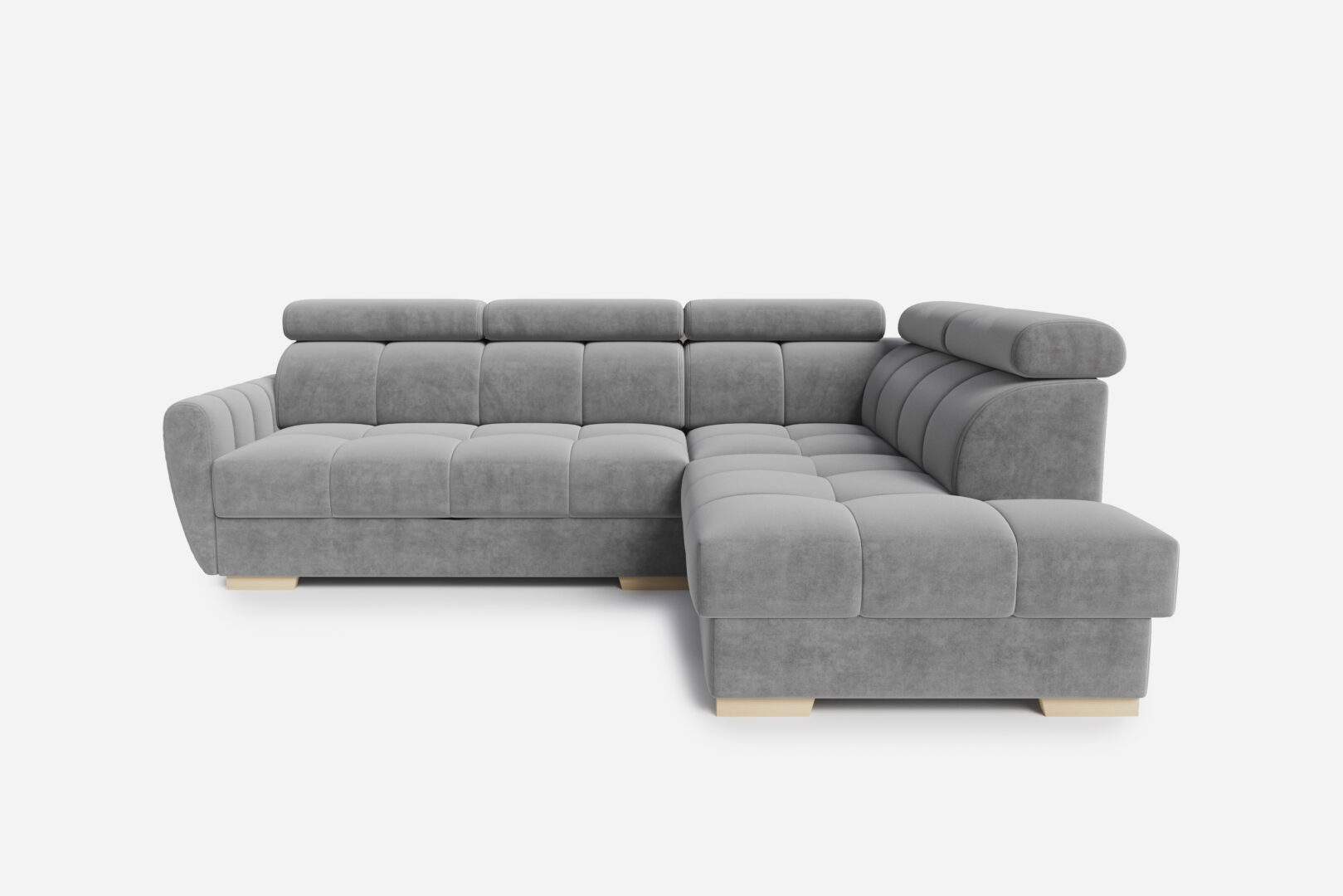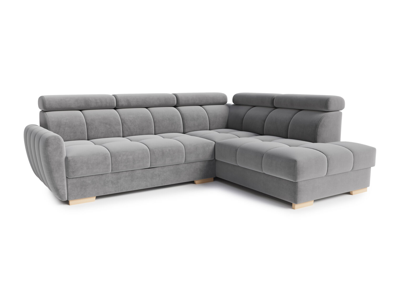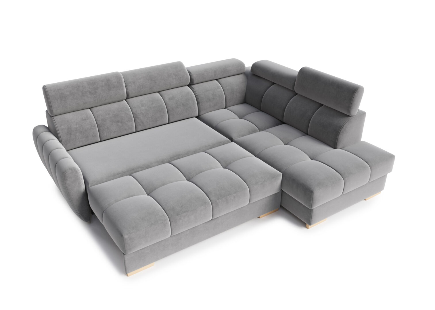 The NewDay corner sofa is a comfortable and functional corner sofa with rounded shapes. Its ergonomic design, with a rounded backrest, not only guarantees comfort but also adds a subtle aesthetic to the sofa. The stitching on the seat and armrests adds character and elegance to the furniture, creating an interesting detail. One of the practical features of the Manhattan is its sleeping function, which is unfolded by means of a ‘puma’ type automatic mechanism. The sofa unfolds in one smooth movement, ensuring a comfortable sleep. An additional feature is the bedding box, located in the Ottoman, which makes the corner sofa not only a place to relax but also a practical storage solution.