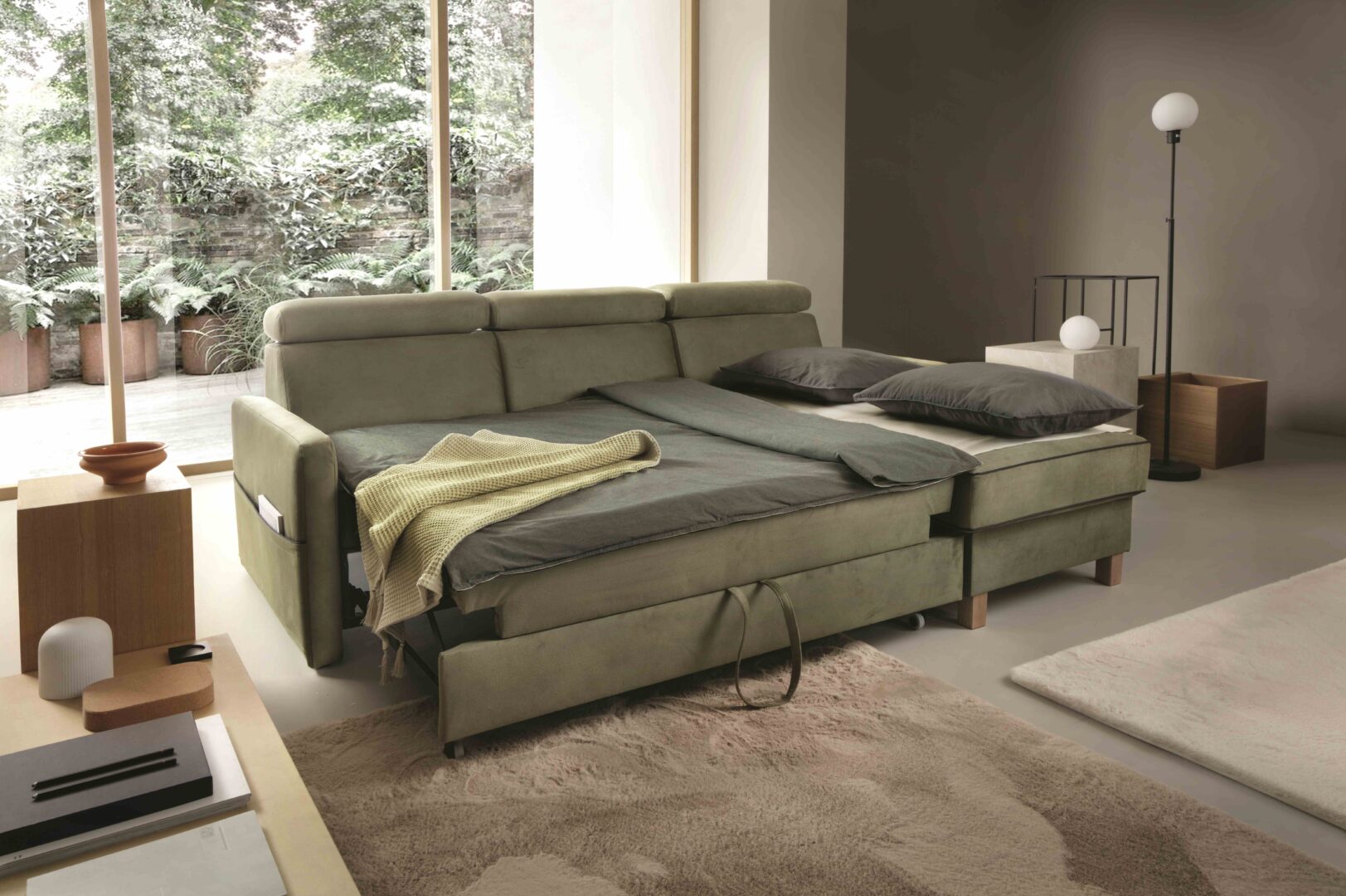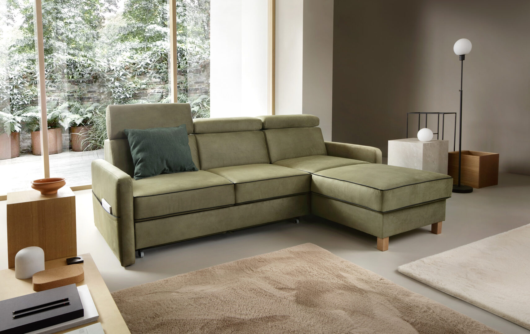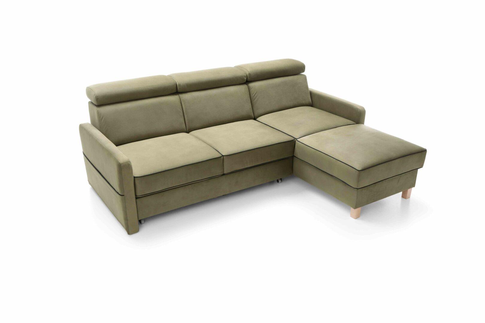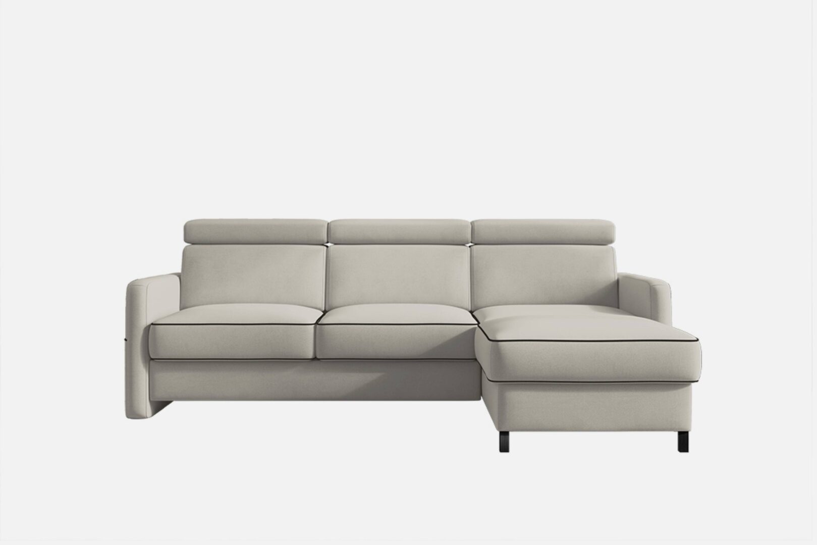 The Milano corner sofa is an extremely sleek solution, perfectly suited to any living room, regardless of its size. This small model is ideal even for hard-to-set-up interiors. Its characteristic features include pockets on the outside of the armrests, black piping and compact dimensions. The seat uses a combination of corrugated springs and higher-density foam to provide high seating comfort. The fixed backrest filled with highly flexible foam and adjustable headrests provide excellent support for the back and neck. The corner sofa is equipped with a lounge function, easy to open with a ‘dolphin’-type automatic mechanism. The entire sleeping area is characterised by uniform elasticity, and the bedding box in the Ottoman is an added bonus. This model is versatile, allowing a right- or left-handed layout to be created as required.